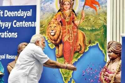 PM Narendra Modi paying tributes to Swami Vivekananda on the occasion of 125th anniversary of Vivekananda’s Chicago Address and birth centenary of Deendayal Upadhyay in New Delhi on Monday.